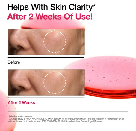 - سيروم مائي غني بـ 10% من النياسيناميد و4% من حمض الترانيكساميك لاستهداف البقع الداكنة العنيدة وفرط التصبغ من خلال المساعدة في تقليل تغير اللون.