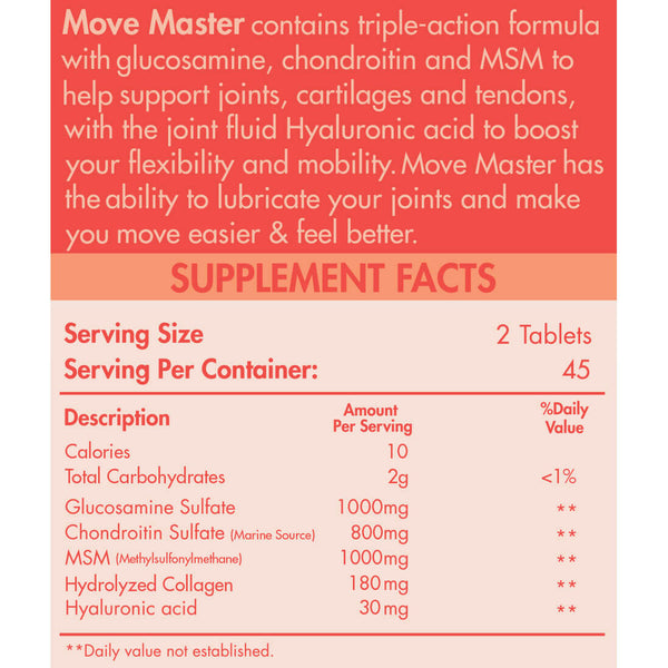Move master Description It is a food supplement that contains several effective substances that can rebuild cartilage again and prevent its erosion. It also contains ingredients that reduce pain resulting from...
