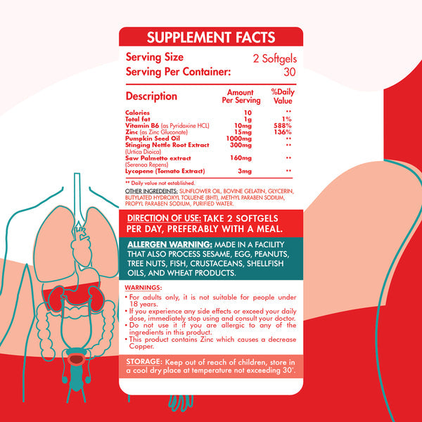 Ingredients: Saw Palmetto Extract (SPE): 160 mg Pumpkin Seed Oil: 1000 mg Stinging Nettle Root Extract: 300 mg Lycopene: 3mg Zinc gluconate: 15 mg Vitamin B6: 10 mg