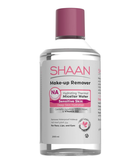 SHAAN Hydrating Therma Micellar Water removes makeup and hydrates the face without irritating the eyes or sensitive skin.